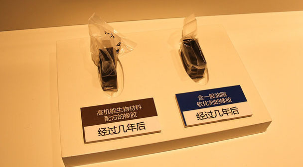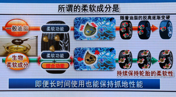 传统普通轮胎为确保轮胎抓地性能,会在轮胎的生产过程中添加从石油中提取的油性软化剂。这种油性软化剂的消减及轮胎发热,会导致橡胶的物理特性发生变化(例如硬化),从而影响轮胎的抓地性能。为了解决这个问题,住友橡胶通过生物技术的开发手段,从植物中提取了能够和橡胶分子结合的“软性成分”,开发出可以长效维持橡胶初始性能的材料配方,证明了高技能生物材料的有效性。