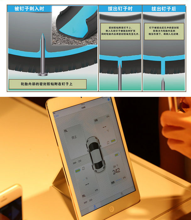 密封胶轮胎技术(CORESEAL)这种技术是在轮胎内壁上,涂抹特殊材质的密封胶,当轮胎被异物刺入后,轮胎内部密封胶粘附在钉子上。目的就是防止轮胎漏气。